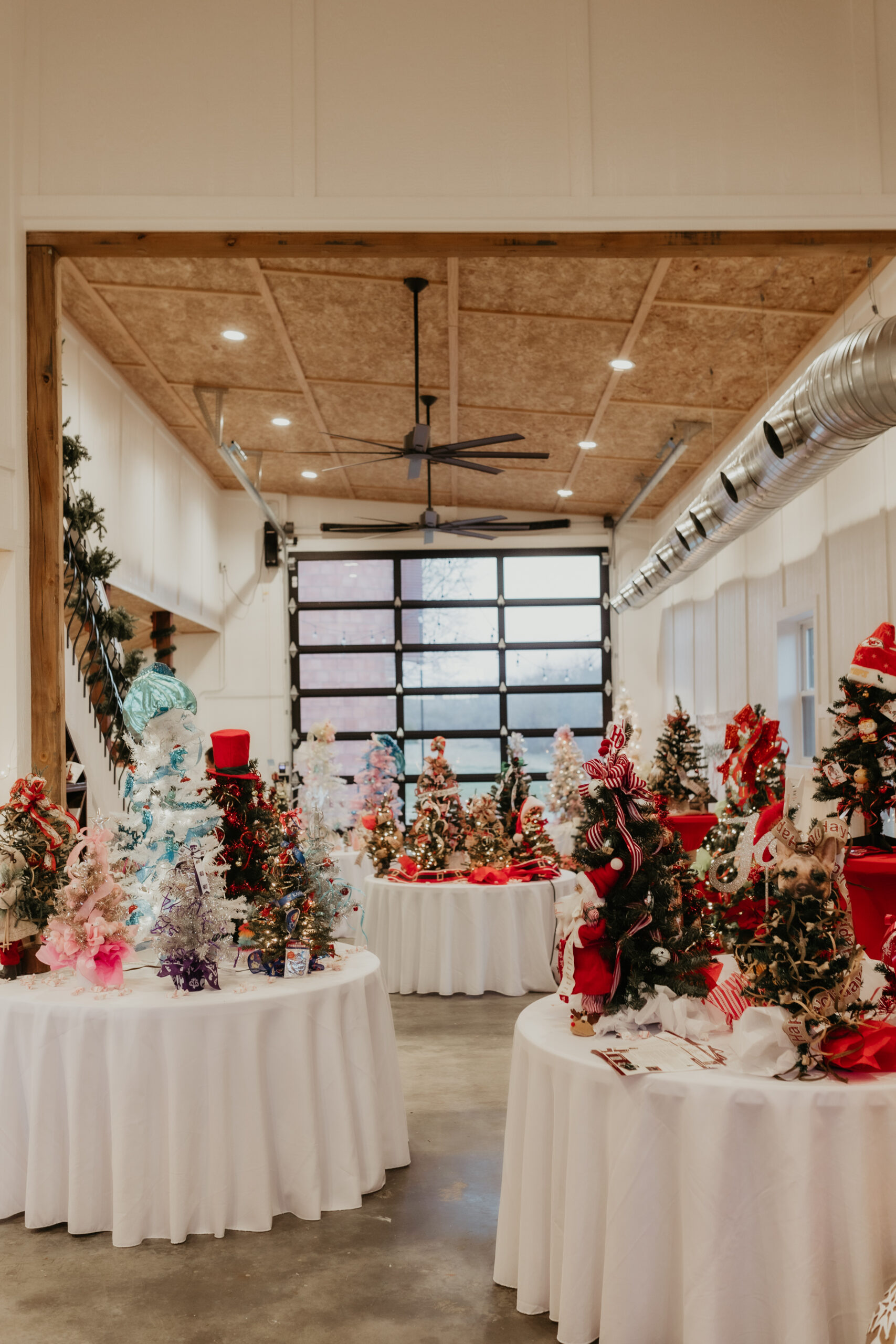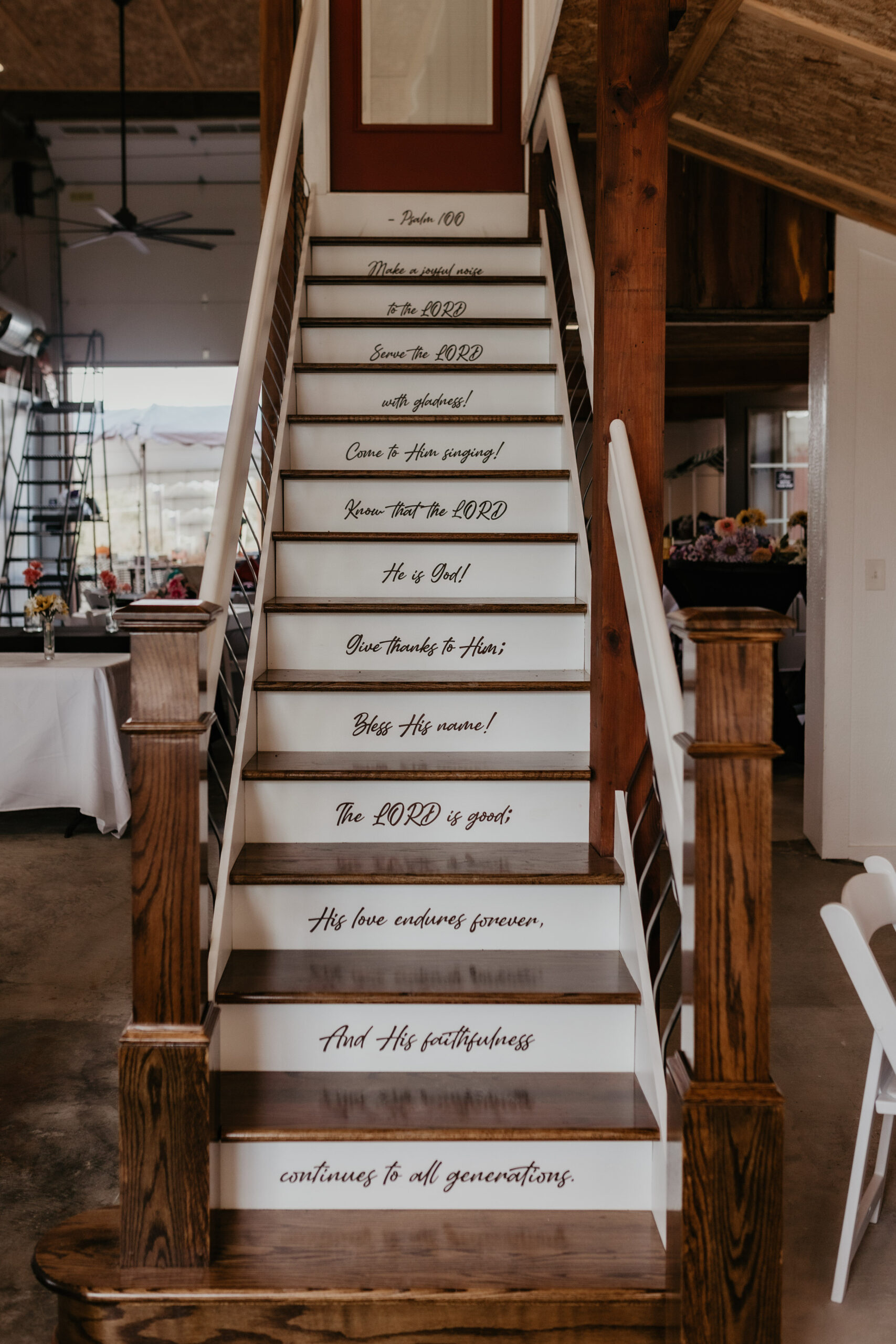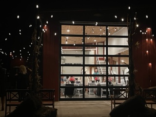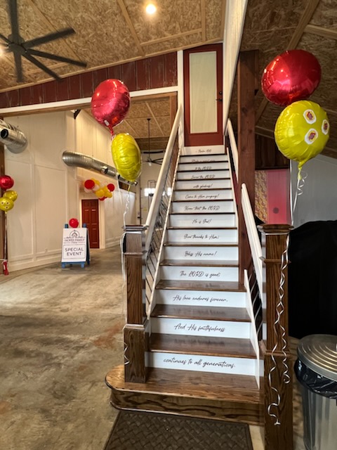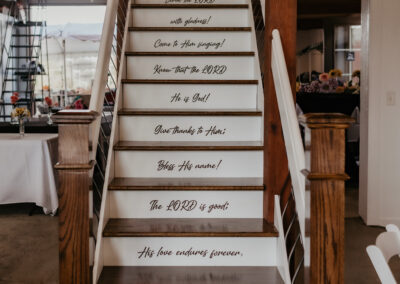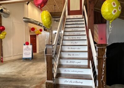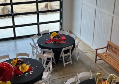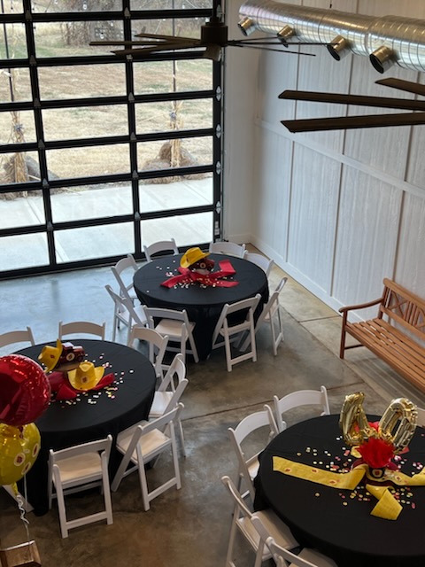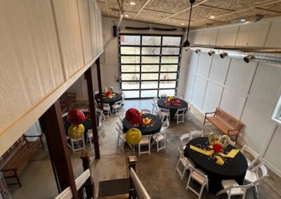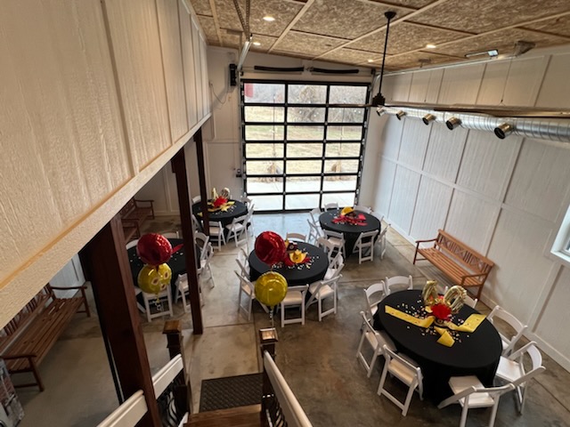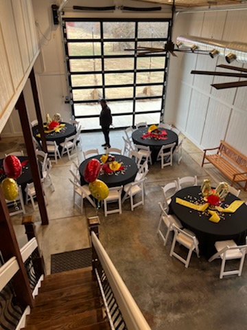 The 16 foot glass commercial door allows the outside to come in and floods the main floor with light during the day and sparkling stars at night. Our signature staircase is a cornerstone element on the main level. The expansive event space features, state of the art heating and air conditioning. Two custom built bathrooms by master craftsman, Ron Dykes were constructed with live edge wood believed to be from a 100 year Bonner Springs tree. The old world tin ceiling adds to the character of Big Red. Our industrial prep kitchen works well for all size catering companies and provides designated parking with their own private entrance. There is also parking galore for you and your guests.