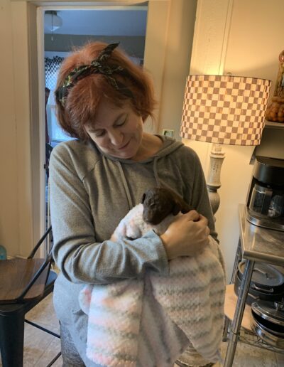 Brindle with the nickname “Chester” because of his chestnut brown rich and beautiful deep dark brown with variegated colors and white markings. Stunning! He is laid back, a bit independent and a real cuddle boy who loves to snuggle!